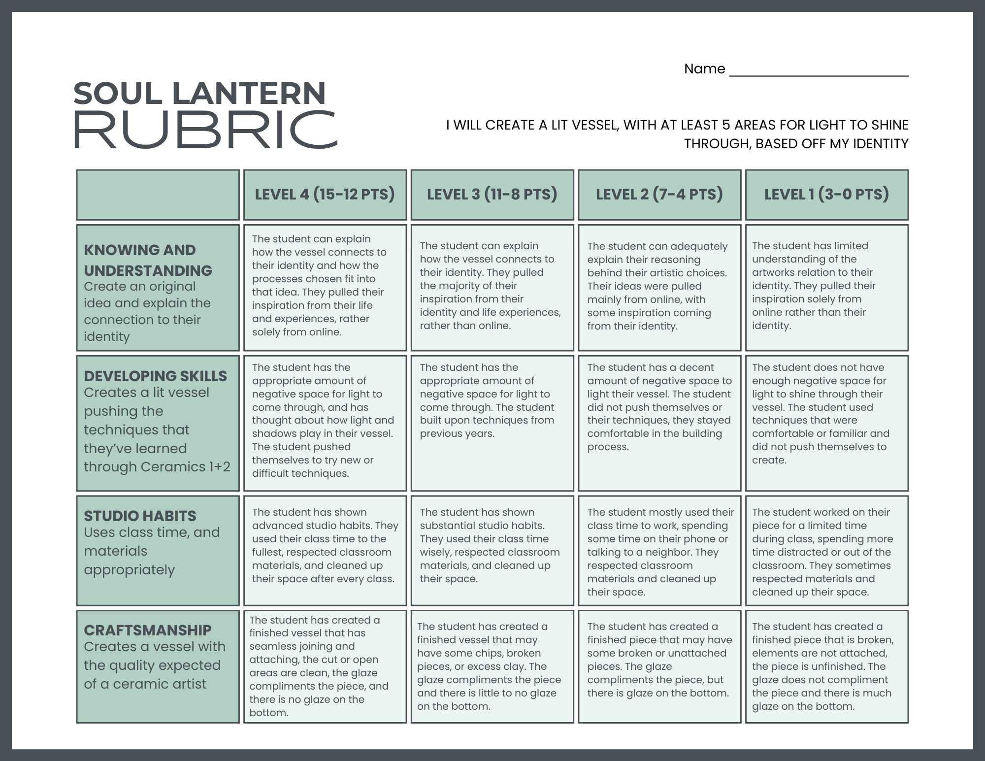 Students will create a vessel with the craftsmanship of artists, their lantern will be structurally sound, no excess clay particles, no broken pieces, etc.